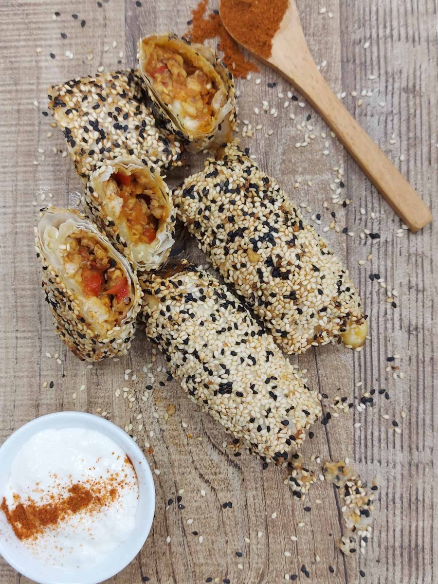 Κόψτε σε τρίγωνα τα φύλλα κρούστας. Με ένα κουτάλακι τοποθετήστε τη γέμιση και τη γραβιέρα, τυλίξτε σε μπουρεκάκια, βουτήξτε πρώτα στο μείγμα με το αυγό και ύστερα στο μείγμα με τους σπόρους.