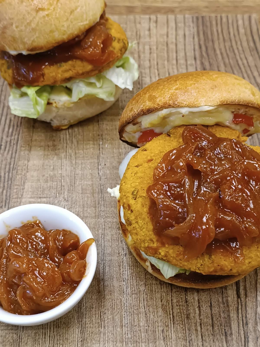 Για τα burger βάλτε σε ένα μπολ τις φακές, την γλυκοπατάτα, το αυγό, τη βρώμη, το ελαιόλαδο, το γάλα,τη μουστάρδα, τα μπαχαρικά και ομογενοποιήστε.Πλάστε σε μικρά «μπιφτέκια», στην συνέχεια ψήστε τα σε προθερμασμένο φούρνο στους 160ο C, για 20 λεπτά.