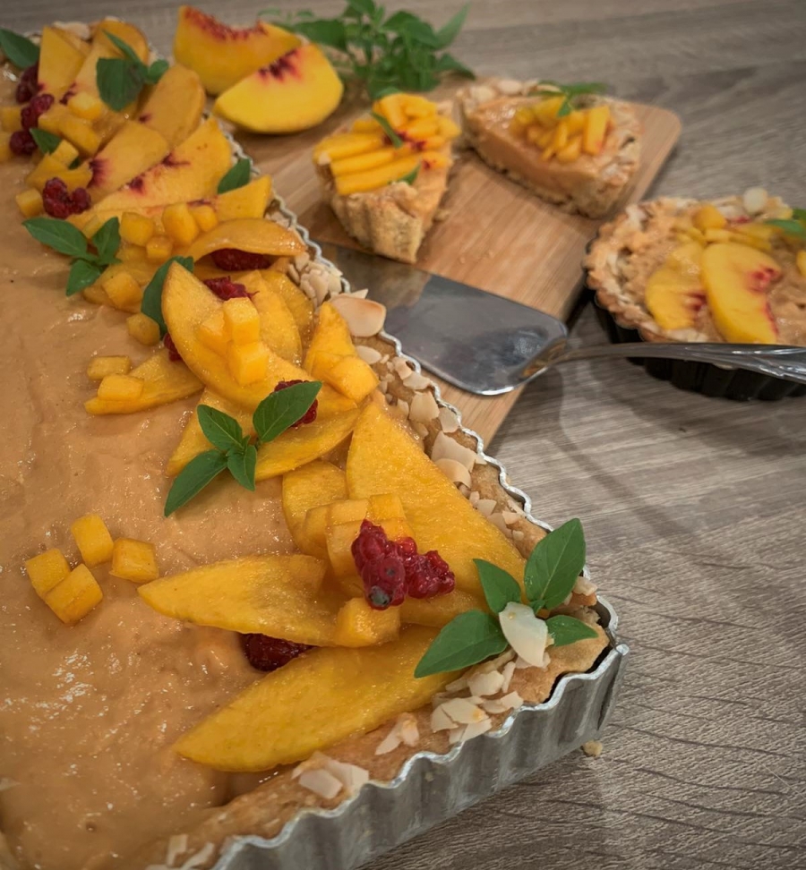 Συνθέστε την τάρτα απλώνοντας την κρέμα πάνω από τη βάση της τάρτας και διακοσμήστε με φέτες ροδάκινο.